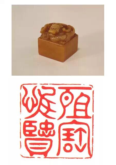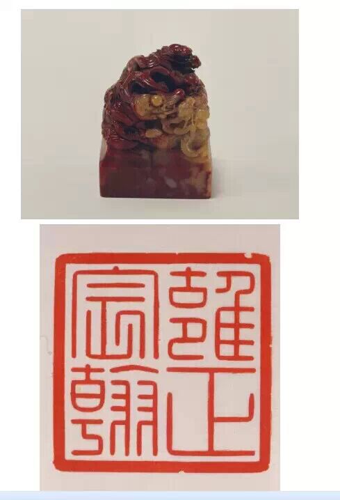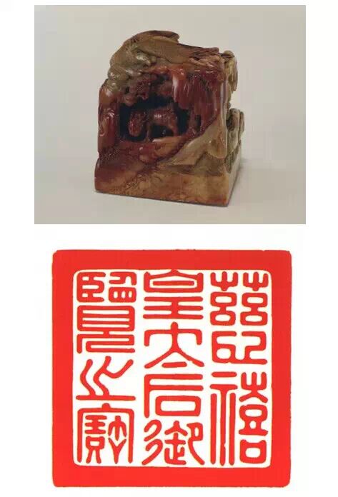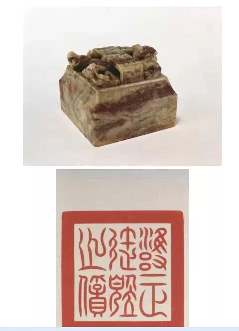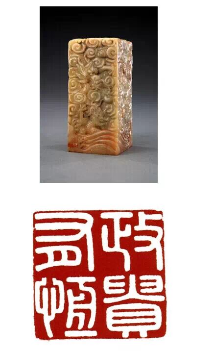 清雍正,壽山石質,海水行龍紐方形璽,漢文篆書。面 310px 見方,通高 287.5px ,紐高 150px 。寶璽四周淺浮雕夔龍紋飾,上部海水行龍借天然石色,雕刻精細。