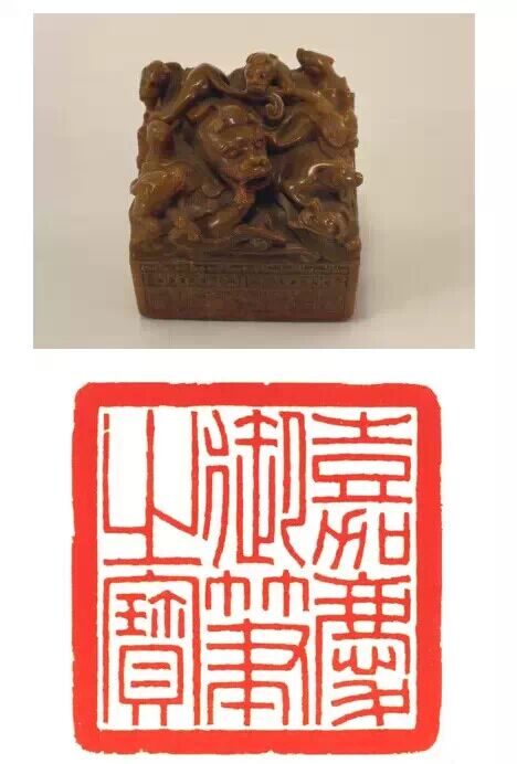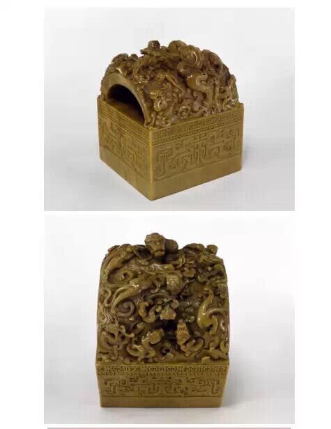 清雍正,壽山石質,雕夔龍瓦紐,漢文篆書。面 330px 見方,通高 375px ,紐高 162.5px 。