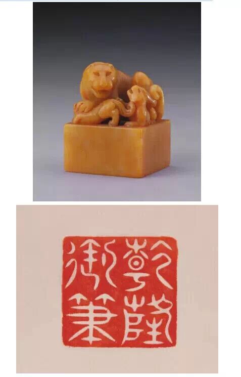 清乾隆,田黃石質,子母獅紐方形璽,漢文篆書。面 117.5px 見方,通高 155px ,紐高 87.5px 。