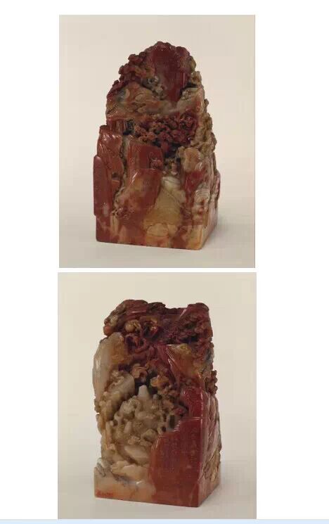 清雍正,壽山石質,隨形雕山水人物方形璽,漢文篆書。面 82.5px 見方,通高 175px 。