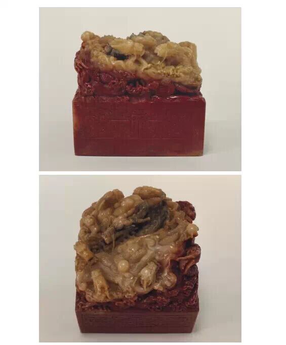 清晚期,壽山石質,隨形雕龍鳳瑞獸方形璽,漢文篆書。面 260px 見方,通高 300px ,紐高 247.5px 。