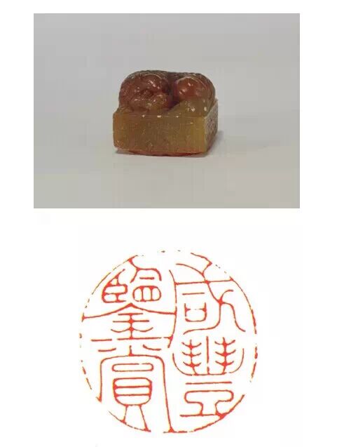 清咸豐,壽山石質,臥獅紐圓形璽,漢文篆書。面徑 95px ,通高 77.5px ,紐高 37.5px 。