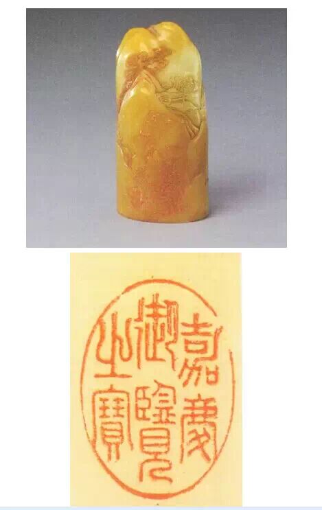 此寶質地一般,有微細裂痕,顏色深淺不一,但治印者因形就勢,用淺浮雕技法雕出蒼松、山石、亭榭,佈局恰到好處,巧妙地掩蓋了石材本身的瑕疵,堪稱妙品。此寶在嘉慶帝御筆上鈐用較多。
