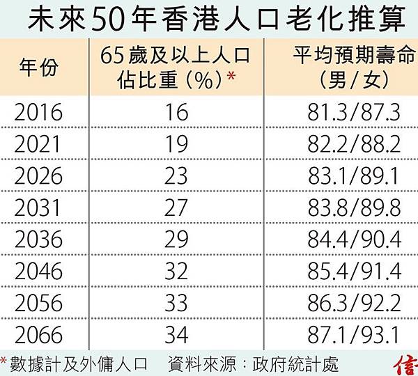 統計處副處長陳萃如表示,人口老化仍是社會面臨的最大挑戰,65歲或以上的長者人口超過230萬,情況將維持最少30年,至2066年會增至達259萬,佔整體人口36.6%(不包括外傭),平均2.7人就有一名長者,若連外傭計算在內,則長者人口將佔總人口34%【表】。