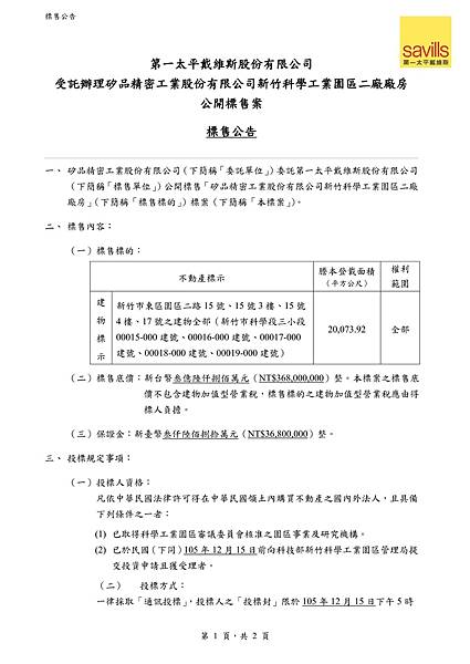 第一太平戴維斯將公開標售位於竹科園區二路的高科技廠房,建物為地上4層、地下1層,基地面積2117.5坪,建物總面積6072.36坪,單層面積近千坪,標售底價3.68億元,開標日期為12月16日。