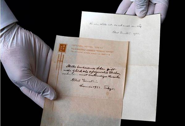 天才物理學家愛因斯坦於1922在日本東京簡單寫下對快樂生活看法的便箋,由Winner's拍賣行週二在耶路撒冷拍賣會以156萬美元(約660萬令吉)賣出,買家是要求匿名的歐洲人。