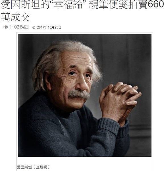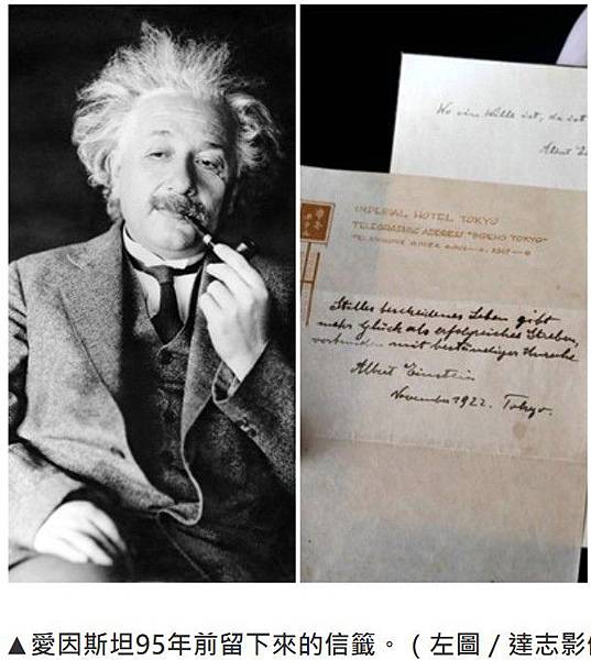 德國天才物理學家愛因斯坦(Albert Einstein)以相對論影響全世界,95年前他在東京隨手寫下兩句話,表達對幸福生活的看法,「恬靜簡樸的生活,比汲汲營營追求成功更為快樂」、「有志者、事竟成」,並將信籤送給當年幫他傳信的信差。這兩張信籤將會在24日耶路撒冷拍賣。