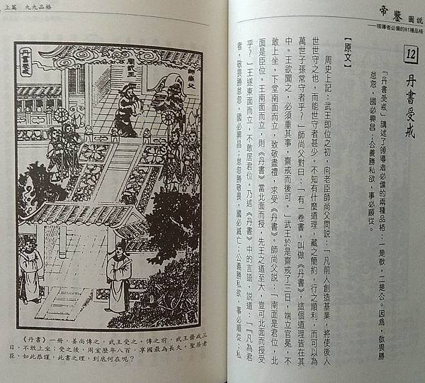 周武王在剛剛即位不久,就召見姜太公並向他請教:「前輩人開創的基業,都希望後世子孫能夠代代繼承,但真正能守住基業的人,卻少之又少。是否有什麼方法,繼承起來很容易,又方便執行,可以叫後世子孫,都去效法而使基業長存的嗎?」姜太公回答說:「有這麼一卷書叫做《丹書》。你問的那個方法,就在這部書中。如果您想要知道,必須極其誠懇的預先進行沐浴齋戒,然後才能聽我傳授。」