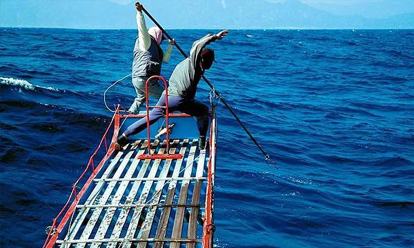 ▲正副鏢手指引船身、觀察旗魚現身與否,抓緊時機下鏢;圖為為遊客示範之漁船,依規定漁船必須離海30浬方能捕魚。(圖/記者陳姿吟攝)