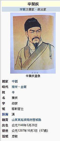 辛棄疾(1140年5月28日-1207年10月3日,字幼安,號稼軒居士,山東東路濟南府歷城縣(今山東歷城)人。生於金國,少年抗金歸宋,曾任江西安撫使、福建安撫使等職,因歸正人的身份,辛棄疾也始終未能得到南宋朝廷的重用以及實現他北伐的夙願。追贈少師,諡忠敏。