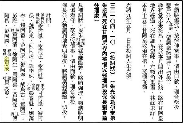 主要題名 新竹縣樹杞林墾戶金惠成等為事有委曲不得不據情稟明懇恩俯賜察核舉辦事