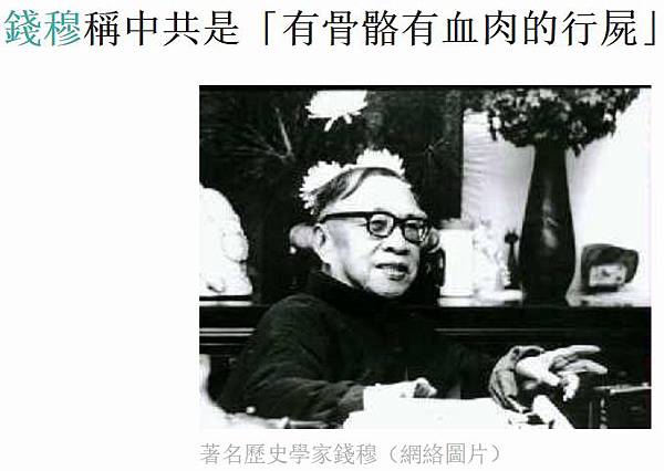 同時,錢穆繼續著書立說,嚴厲批判中共政權種種倒行逆施之行徑。他在《中國思想史》中寫道:「此刻在中國蔓延猖獗的共產主義,最多將是一個有骨骼有血肉的行屍。……大陸政權正如一塊大石頭,在很高的山上滾下,越接近崩潰的時候,其力量越大……三面紅旗多恐怖,紅衛兵文化大革命多恐怖,下面還有更恐怖的事。」可見,他熱愛的是文化意義上的中國,而對毀滅文化、扭曲人性的中共政權絲毫不抱幻想。