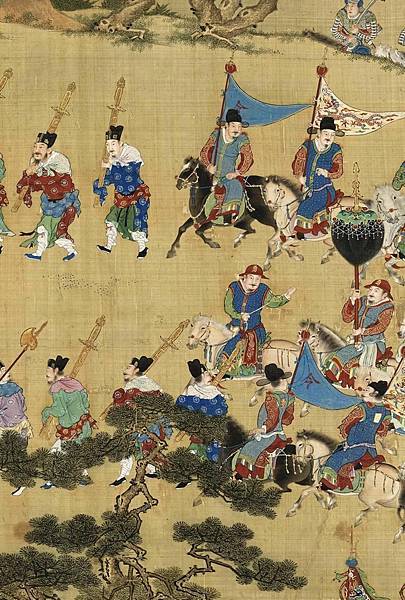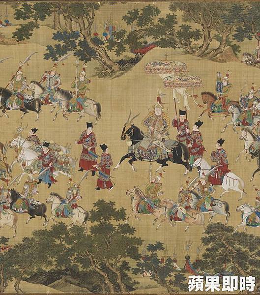 《出警圖》描繪明神宗出京謁陵的驚人陣仗。20歲的明神宗騎黑馬,穿紅色麒麟服、盔甲服的錦衣衛護駕四周)