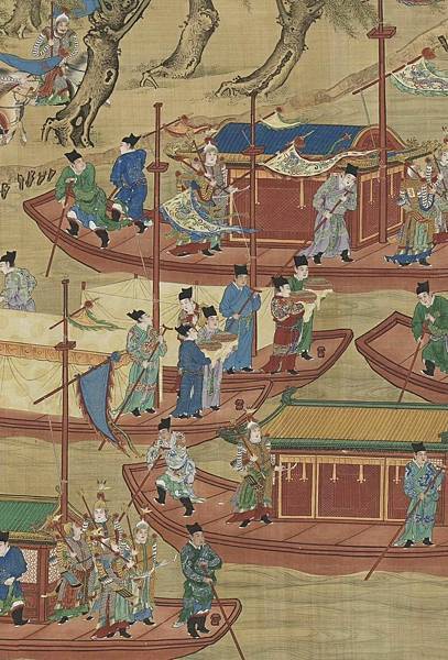 這幅畫描繪出明朝皇帝出京謁陵盛況的宮廷畫卷。描繪的是皇帝在宮廷侍衛的護送下,騎馬出京,聲勢浩大的來到京郊的十三陵拜先祖,然後再坐船返回北京的情景。皇帝一出一入,相互呼應,氣勢壯觀,栩栩如生。