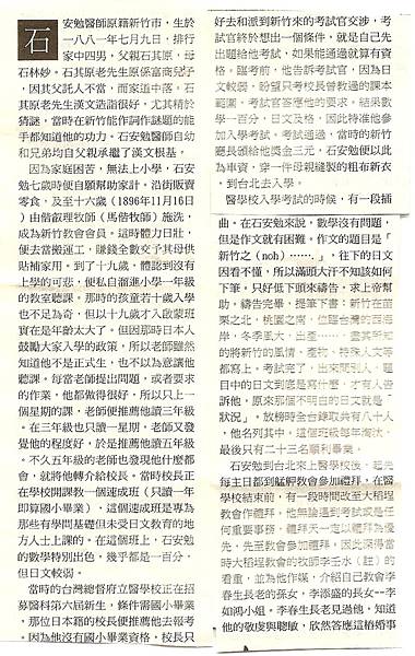 石安勉自接受基督教信仰後,深刻體會到沒有上學的可悲,才進入新竹公學校。1898年台灣總督府訂頒「台灣公學校規則」,新竹公學校設置在原來明志書院的舊址,為新竹初等教育的學校。 公學校原制訂8歲以上14歲以下的學童為招收對象,修業年限6年,但依地方之狀況得為4年(張永楨,文教志:5142)。殖民體制下的差別教育,孩童10歲入學不足為奇,但以19歲才就學,實在需要克服許多心理障礙。