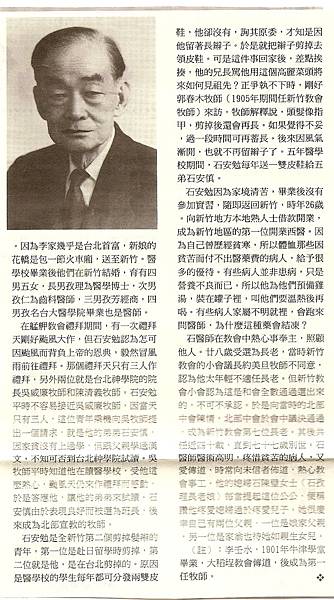 石安勉醫師,生於1881年7月9日,父親石其原,母親為石林妙,排行家中四男。16歲,1896年11月16日由偕叡理牧師領洗。