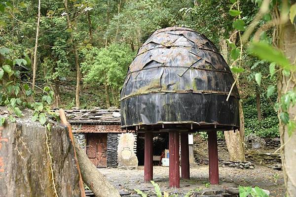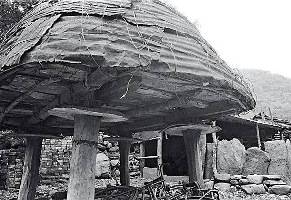 1910年代,一群排灣族族人站在村落中的空地,男女老少均有。值得注意的是,右側有一座相當大座的骷髏架。現存影像文獻顯示,骷髏架多設於村莊外的樹林間。不過,這張照片中的骷髏架卻是安放在村落中央的空地上,也是部落活動的公共場所。由於獵首被視為英勇的行為,獵首越多地位越高,因此敵人和仇家骷髏頭的展示,等同勝利榮耀的宣示,骷髏架的性質有如「凱旋紀念碑」,安置於部落公共空間也就有了合理性。族人的左後方竪起日本國旗,顯示殖民當局的官員已經進入山區部落,但尚末以武力強制改變原住民的生活習俗。(1) Facebook https://bit.ly/3q026Co