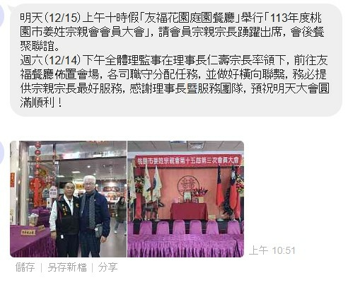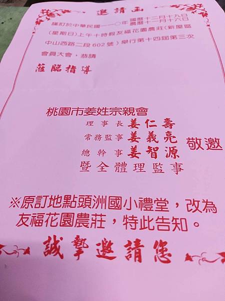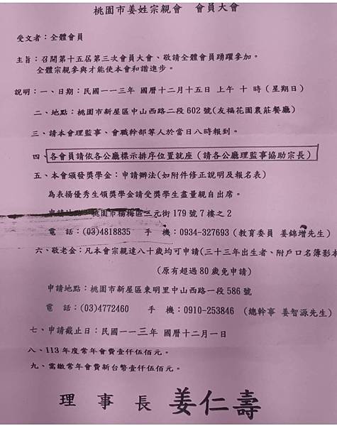 桃園市姜姓宗親會會員大會--(12/15)上午十時假「友福花園庭園餐廳」舉行「113年度桃園市姜姓宗親會會員大會」
