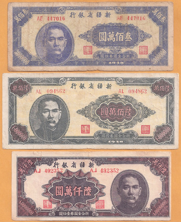 1948年隨著國民黨的軍事失利,經濟失調,物價暴漲,貨幣貶值,新疆商業銀行再次被改組為新疆省銀行後,鈔票面值越印越大,由最小面額1分到發行面額6億、30億,直至最大面額竟然達60億元,可謂曠古未聞,創世界貨幣史之最大笑話。這張60億元的鈔票上印有「摺合金圓券壹萬元」字樣。一張鈔票印有兩種面值,這在我國貨幣史上是罕見的。