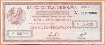 波利維亞的「保付支票」這種形式的貨幣也很普遍存在,也有稱作「定額支票」或「臨時債券」;這類「支票」有個共同的特點,一是有時效性,譬如這一枚發行日期是1984年12月21日,在票子的背面註明「從發行日起計算90天內有效」。票子上也有說明:「此枚支票是合法的全國性流通貨幣,可以支付公共或私人的任何交易。」而且,此枚支票的票面設計也比較像一張支票。