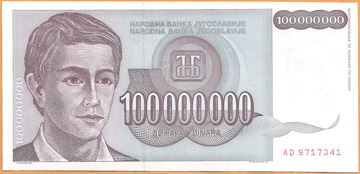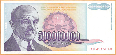 克羅埃西亞1993年的通脹率為1500%。與獨立的塞爾維亞克拉伊納共和國相比,政府發行的最大面額紙幣為100,000第納爾,1993年國家進行貨幣改革,推出新貨幣單位庫納。看來前南地區還是塞爾維亞人膽大敢為,大額紙幣都出現在他們那裡,南斯拉夫的塞爾維亞共和國, 波赫的塞族共和國,克羅埃西亞的塞爾維亞克拉伊納共和國。戰爭加上通脹,加上奇高失業率,苦了那些手持十幾個零大額鈔票的老百姓。