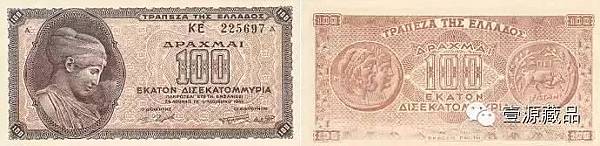 1944年11月3日希臘發行了100萬億德拉克馬紙幣。