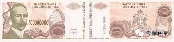 1992年波赫獨立後發行了紙幣,與此同時波赫的塞族共和國也發行了自己的紙幣。 這裡我介紹的高通脹紙幣就是塞族共和國發行的500億第納爾。 而波赫中央政府1993年發行的最大面額是1億第納爾,這枚大額幣是在原面值100第納爾紙幣上加印改值而成。從紙幣發行面額大小來看,波赫塞族地區比非塞族控制地區的通脹更嚴重。不過這僅僅是我的推論,沒有調查數據支持。