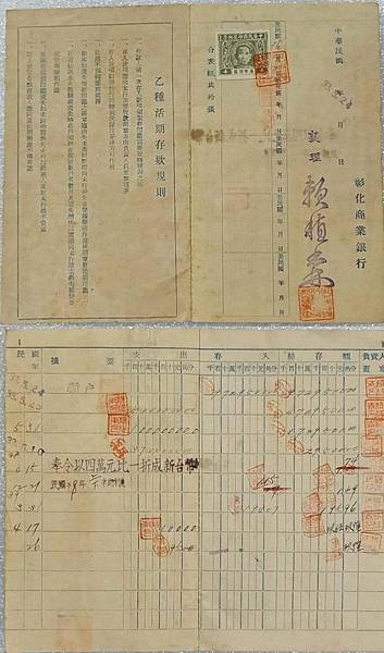 謝謝網友梁麗緹分享舊時的彰化商業銀行存摺,裡面記載了存款金額於民國38年(1949年)6月15日奉令以四萬元台幣折成一元新台幣,於是原本帳戶裡的台幣29,500元在一夕間變成了新台幣0.74元。