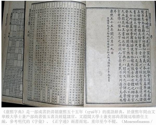 《康熙字典》是一部成書於清朝康熙五十五年(1716年)的漢語辭典,於康熙年間由文華殿大學士兼戶部尚書張玉書及經筵講官、文淵閣大學士兼吏部尚書陳廷敬擔任主編,參考明代的《字彙》、《正字通》兩書而寫,重印至今不輟。(Mosesofmason/Wikimedia Commons CC BY-SA 3.0)