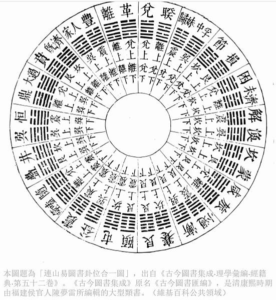 本圖題為「連山易圖書卦位合一圖」,出自《古今圖書集成·理學彙編·經籍典·第五十二卷》。《古今圖書集成》原名《古今圖書匯編》,是清康熙時期由福建侯官人陳夢雷所編輯的大型類書。(維基百科公共領域)