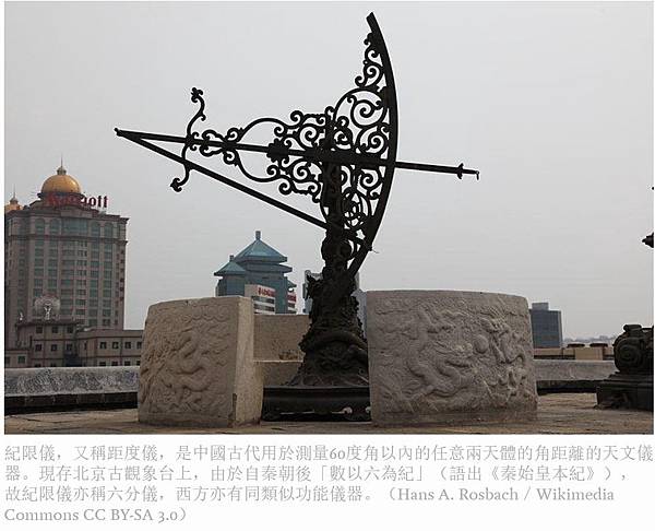 紀限儀,又稱距度儀,是中國古代用於測量60度角以內的任意兩天體的角距離的天文儀器。現存北京古觀象台上,由於自秦朝後「數以六為紀」(語出《秦始皇本紀》),故紀限儀亦稱六分儀,西方亦有同類似功能儀器。(Hans A. Rosbach/Wikimedia Commons CC BY-SA 3.0)
