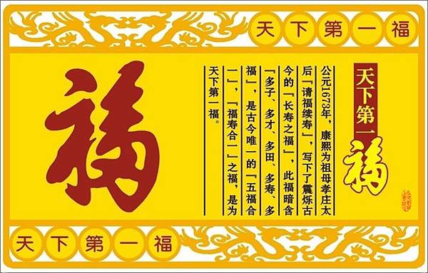 “天賜鴻福”、“天下第一福”。此福字暗含“多子、多才、多田、多壽、多福”,是古今唯一的“五福合一”、“福壽合一”之福。而康熙為祖母請福,自身亦送福得福。