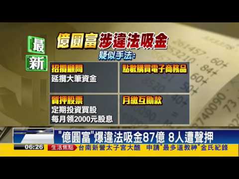 新北地檢署及高雄地檢署發動搜索,扣得現金1300餘萬元。目前檢方針對詐欺吸金主嫌,聲請羈押禁見!檢調查出億圓富,利用4大吸金手法,老鼠會、互助會、集點換商品、及月領高額顧問費等方式,誘惑民眾投資,短短兩年'吸金將近90億元!