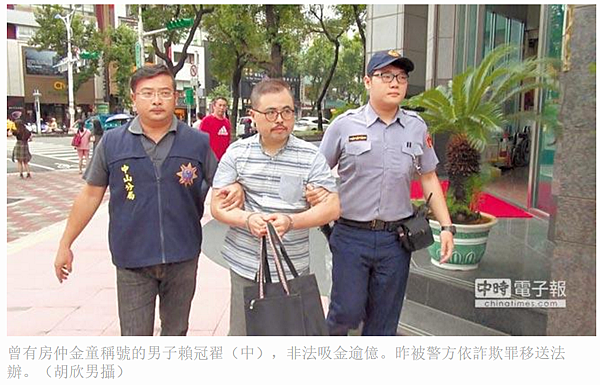 曾有房仲金童稱號的男子賴冠翟(中),非法吸金逾億。昨被警方依詐欺罪移送法辦。(胡欣男攝)