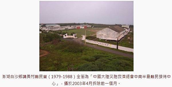 澎湖白沙鄉講美村難民營(1979-1988)全銜為「中國大陸災胞救濟總會中南半島難民接待中心」,攝於2003年4月拆除前一個月。