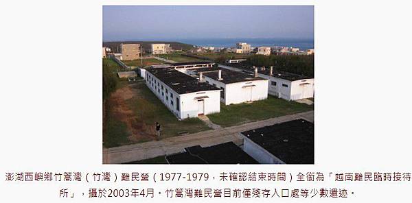 澎湖西嶼鄉竹篙灣(竹灣)難民營(1977-1979,未確認結束時間)全銜為「越南難民臨時接待所」,攝於2003年4月。竹篙灣難民營目前僅殘存入口處等少數遺迹。