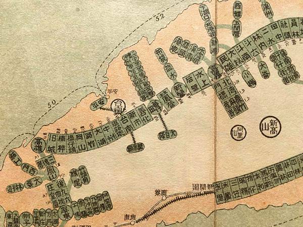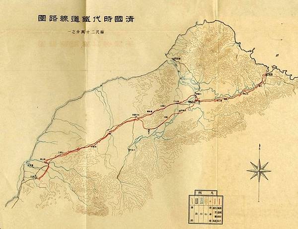 日本時代《臺灣鐵道史》完整介紹清國時期劉銘傳興建之鐵道(內容很多這裡僅截線路圖),這張線路圖裡也有標上改良之線路,可以比較兩者差異。