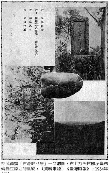 新竹市法源寺後方的覺園裡有一方石碑,石碑陰文草書「皇恩山重」四個字,碑面右側上方刻有「明治四十一年 寄題古奇峰」,左側下方標示落款人「男爵後藤新平」。