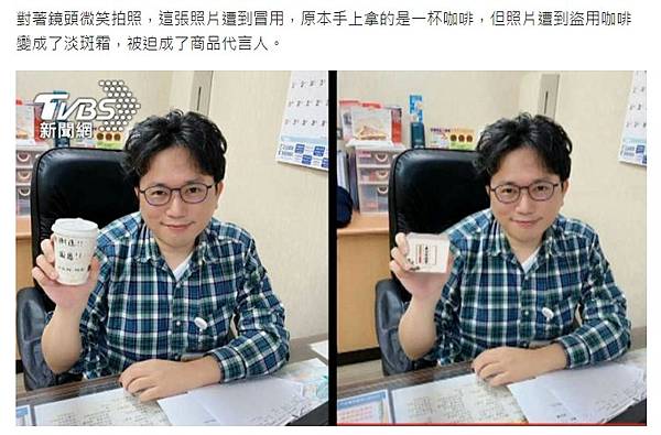 對著鏡頭微笑拍照,這張照片遭到冒用,原本手上拿的是一杯咖啡,但照片遭到盜用咖啡變成了淡斑霜,被迫成了商品代言人。