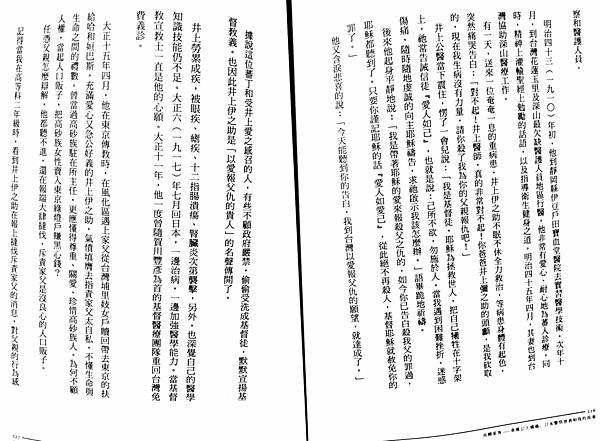 在本書裡,我們也讀到井上的一生及其內心世界,在平實的語調中讓我們深刻感受到他那沈潛內化的信仰熱誠和深厚情感,當我們讀到他面對父親遇難的心境,以及在艱險的生活環境中面對自己數度感染疾病、妻子患傷寒症,特別是1937-45年間長女路得子、次子正明、次女知惠子接續過世的情景時,不禁令人悲從中來、不能自已。