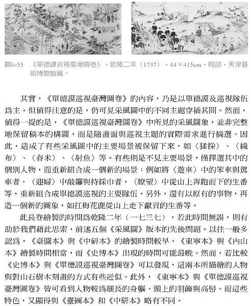 全中卷三刻劃了13幅臺灣原住民圖,為分佈在台灣、鳳山、諸羅、彰化、淡水等地的熟番與生番,各以一男一女等構圖呈現。描寫生番的文字中提到「績樹為布」。 台灣原住民圖像,故宮「四方來朝」職貢圖(二)特展 - 鄭素卿 Tēnn Sòo-khing - udn部落格