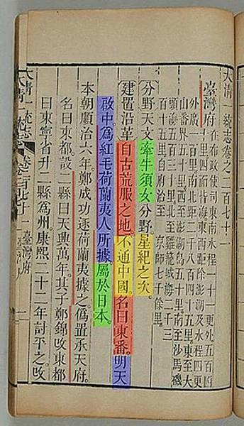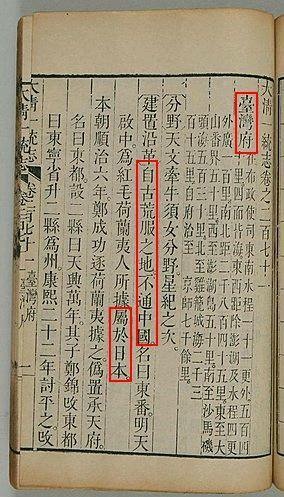 根據《大清一統志》(乾隆版),台灣自古以來,就是「荒服之地,不通中國」、明朝天啟中(1621-27)為紅毛荷蘭夷人所據,屬於日本」。
