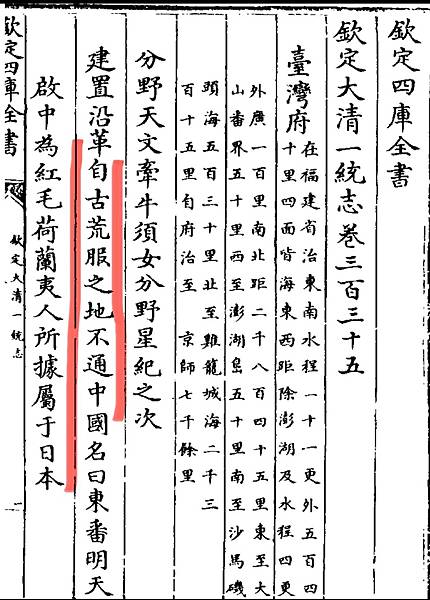 欽定四庫全書|「台灣自古荒服之地,不通中國,名曰東番。明天啟中,為紅毛荷蘭夷人所據,屬於日本」。