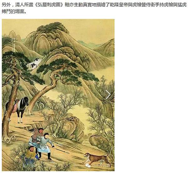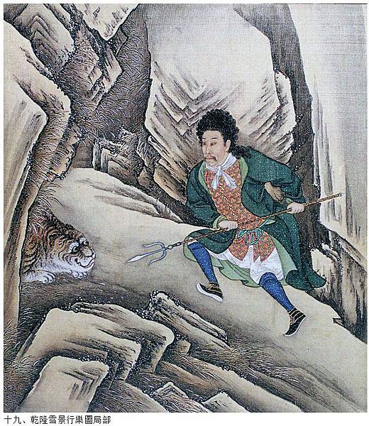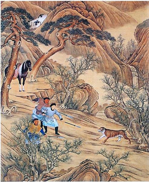 故宮博物院現存最大的兩幅木蘭圍獵圖,即《叢薄行圍圖》和《雪獵詩意圖》,分別表現了在雜草叢生的深莽中殪虎捕虎的驚險情節,以及按照《雪獵十韻》詩細緻描繪的各種行圍活動。另外,清人所畫《弘曆刺虎圖》軸亦生動真實地描繪了乾隆皇帝與虎槍營侍衛手持虎槍與猛虎搏鬥的場面。