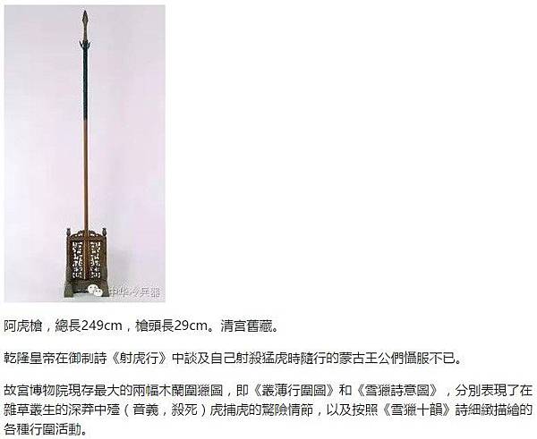阿虎槍,大型長槍,槍頭鐵質,前銳後鋒,中起脊,內有多面血槽,槍庫飾鋄金雲龍纓穗紋,鋄金楷書「大清乾隆年制」款。柄木質或白蠟或者積木竹,桿頭裹布刷大漆外纏鋼絲,槍庫底邊兩側橫系鹿角二,槍頭附皮套,屬於獵虎特種作戰裝備。虎槍營特種兵共600餘人,每人配虎槍一桿,單雙筒火槍一支,弓弩一副,可步騎兩棲作戰。