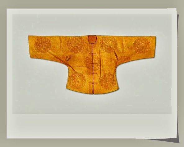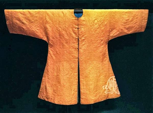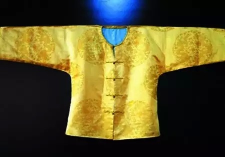 這裡要說明的是,“明黃”就是“淡黃”,是當時帝王專用的顏色,一般貴族或宮妃只能用“金黃色”(即“深黃色”),平民最多只能用“杏黃色”(也即“紅黃色”)。“明黃”在這裡是最名貴的,除皇帝外,只有為皇帝服務的人才特許服飾明黃色。因此一般說來,這種馬褂是天子近侍的服裝。