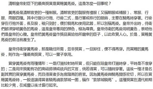 第四類是特使、宣慰中外的官員。通常情況下,皇上特賜某官員黃馬褂的詔曰宣讀後,被特賜黃馬褂的官員須騎馬繞紫禁城一周,這種威武而又莊嚴的儀式,在咸豐年間最為盛行。
