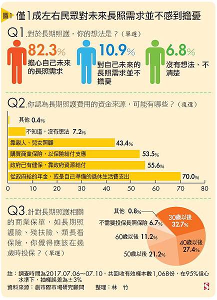 在1,068位受訪者中,有82.3%的人擔心自己未來老後將面臨的長照需求,其中有50.3%的人,家中正有長輩需長期照顧,因此對這個問題特別在意。另外,67.5%的受訪者認為老後需長期照護的時間,平均會在7年以上,其中有4成民眾認為平均時間將逾10年。