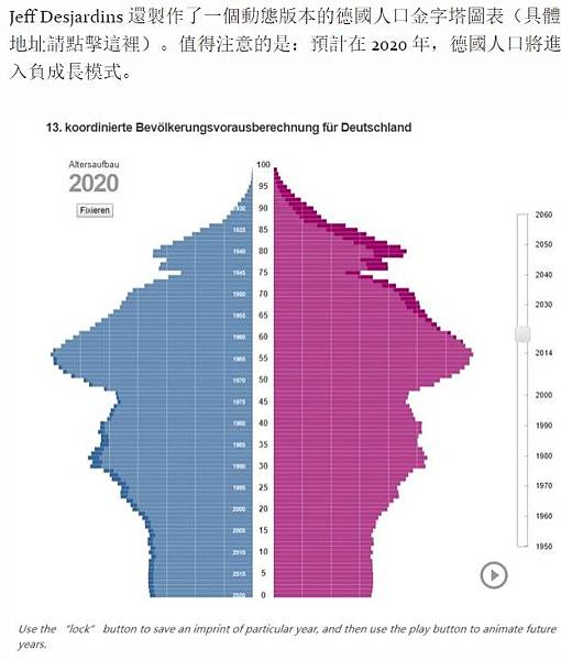 Jeff Desjardins 還製作了一個動態版本的德國人口金字塔圖表(具體地址請點擊這裡)。值得注意的是:預計在 2020 年,德國人口將進入負成長模式。