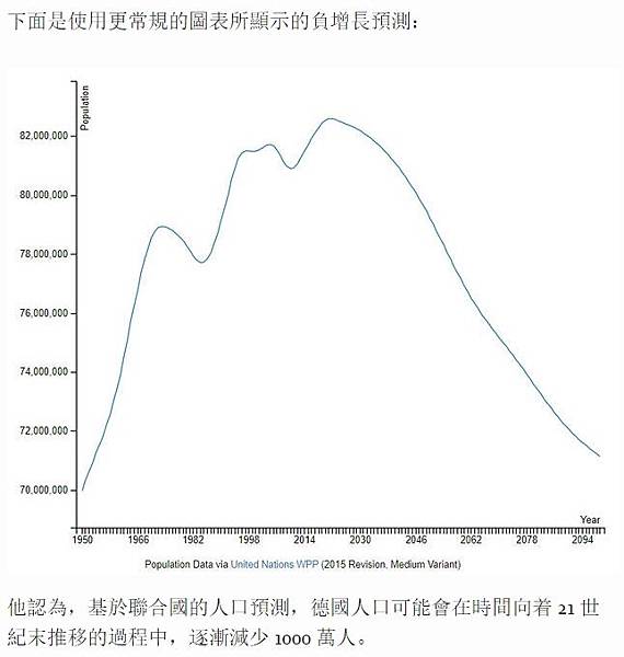 他認為,基於聯合國的人口預測,德國人口可能會在時間向着 21 世紀末推移的過程中,逐漸減少 1000 萬人。